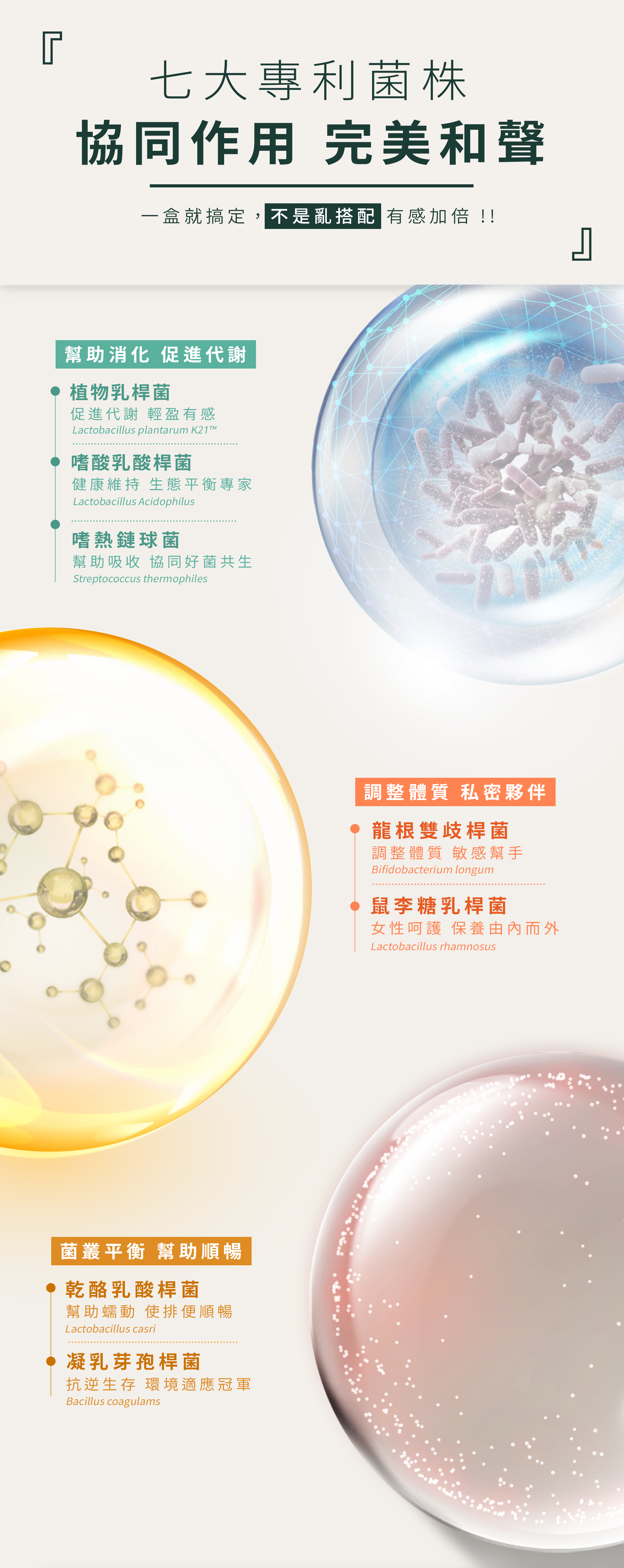 🔸 多菌協同配方:嚴選 7 大專利益生菌,協同作用,打造好菌基底